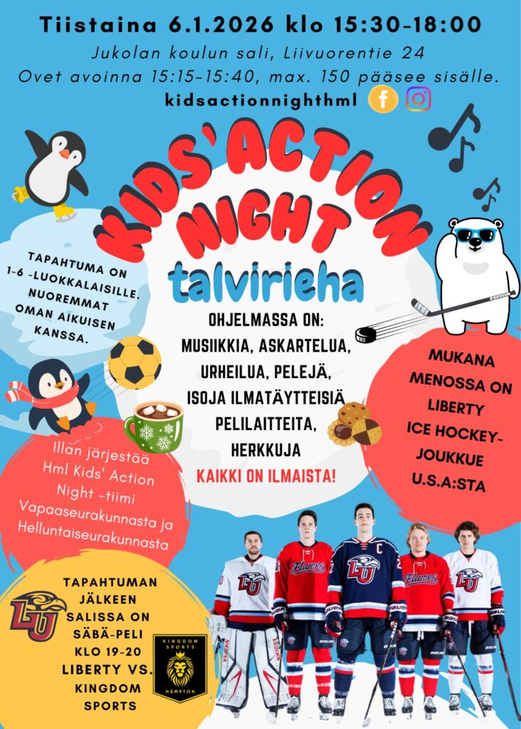 Järjestämme erilaisia perhe ja lasten tapahtumia. Kids Action Night tapahtumia on noin 2-3 kertaa vuodessa. Teemme yhteistyötä Hämeenlinnan Vapaaseurakunnan kanssa. Seuraava Kids’ Action Night tulossa ti 6.1 klo 15.30-18! Ota sivut seurantaan! https://www.facebook.com/kidsactionnighthml